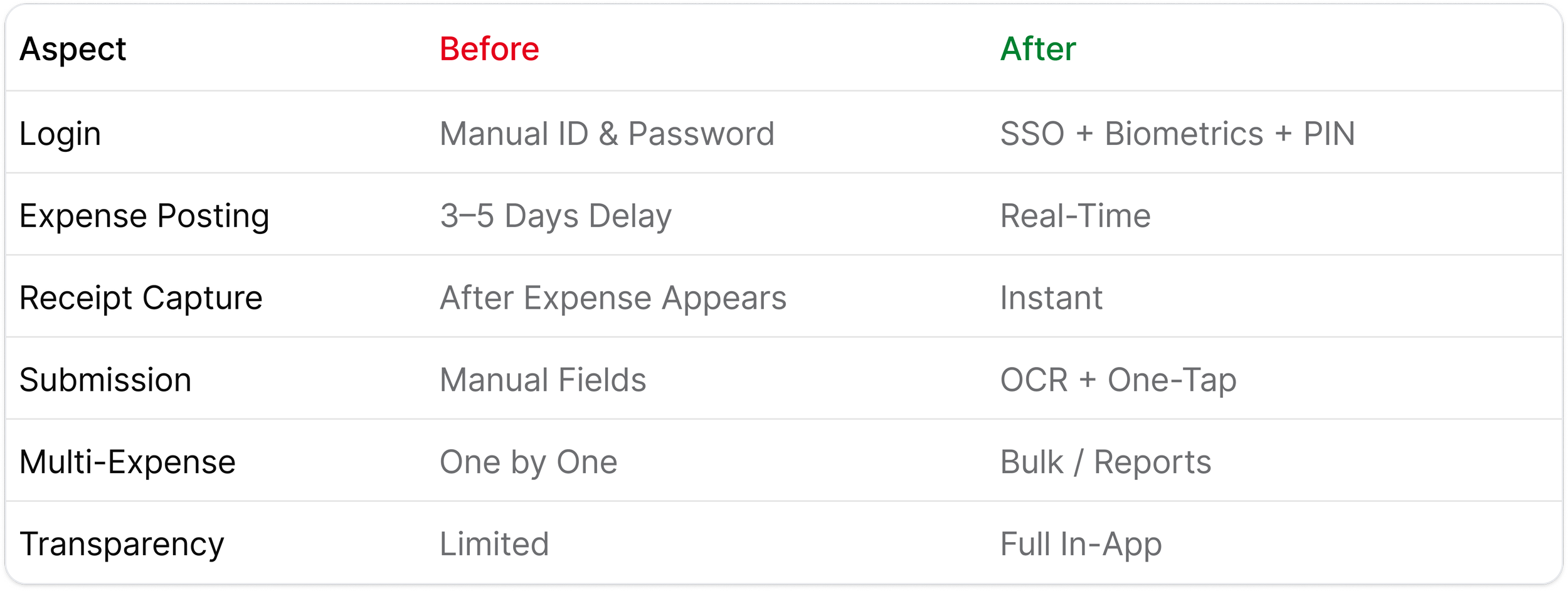 Cardholders relied on delayed posting, manual entry, and outdated authentication that created friction, lost receipts, and reactive workflows