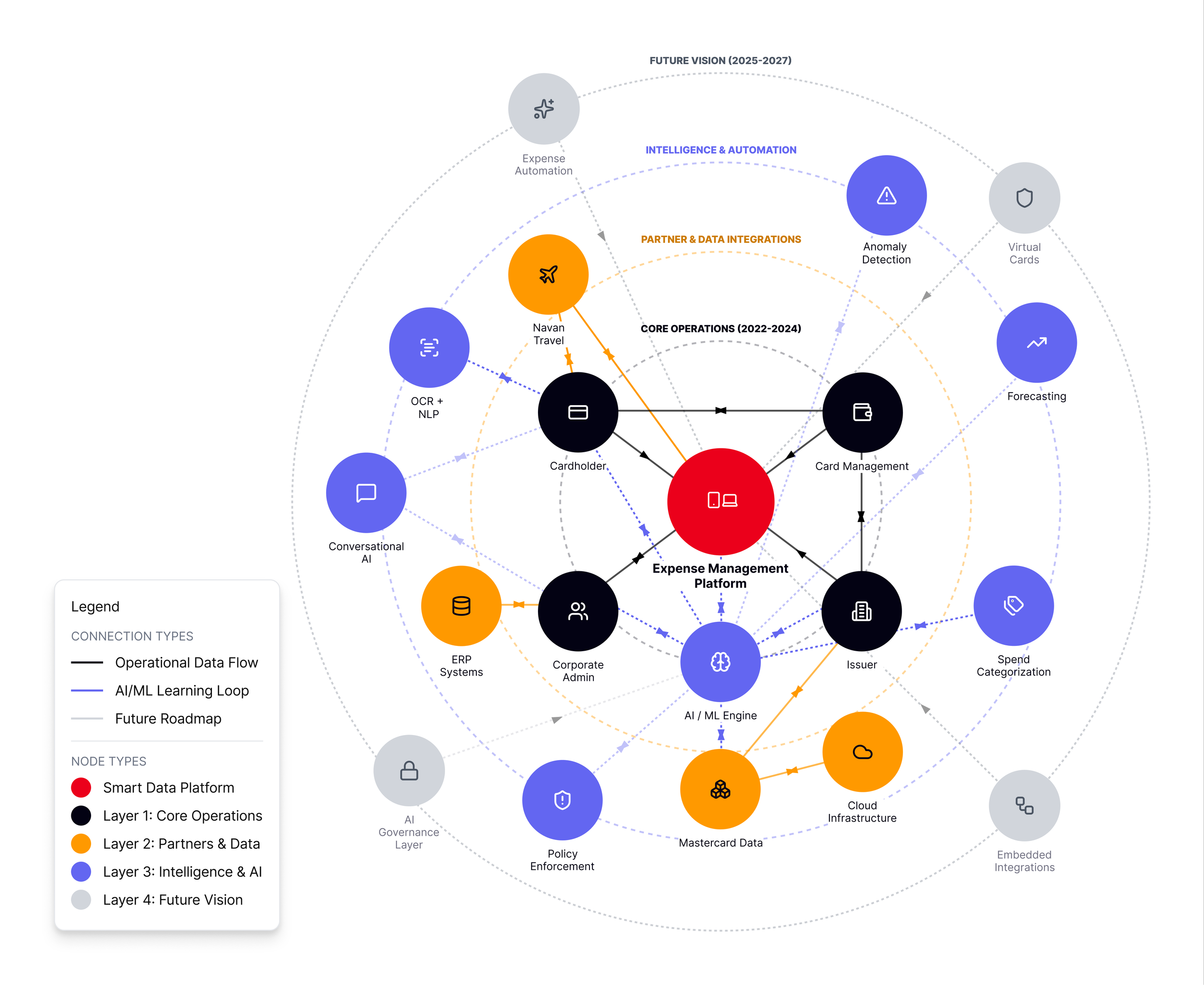 An updated AI-driven service blueprint for corporate expense management, illustrating automation, prediction, and conversational support across the full spend lifecycle.